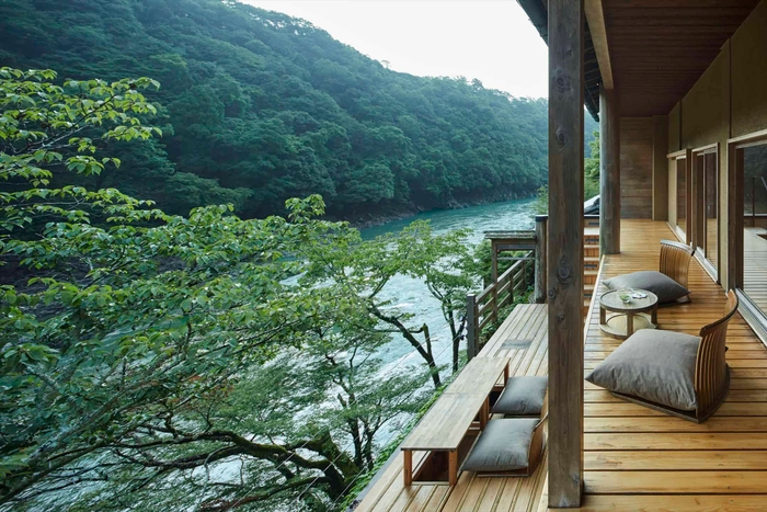 平安貴族が興じた嵐山にたたずむ水辺の私邸で時を忘れる。渡月橋から船に乗り、大堰川を遡った先では、京都に息づく日本の伝統技法を感じる客室、嵐山の情景を映した滋味豊かな日本料理、四季の美しい景観と静けさの非日常が提供されます。
