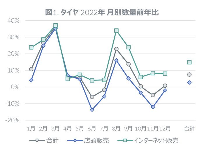 2022年の国内タイヤ市場は数量前年比7.5%増と堅調で、店頭販売では同2.7%増と微増であったが、インターネット販売では同14.9%増と好調であった(図1)。