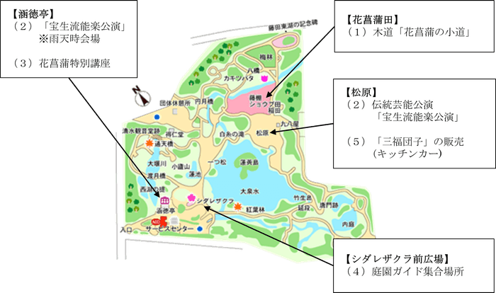 期間中には伝統芸能公演や花菖蒲に関する特別講座も実施します。古典文学や和歌にもしばしば登場し、その優雅な佇まいで季節の移ろいとともに心に静かな感動を与えるハナショウブ。涼やかに彩られた初夏の庭園をお楽しみください。