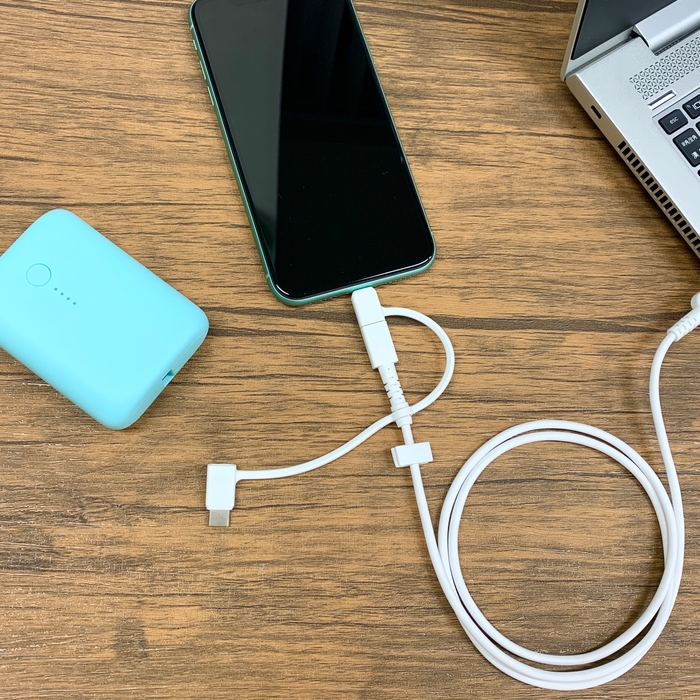 ・USB Type-A to microUSB ケーブルに、Lightningアダプタ&Type-Cアダプタが付いているので、どのタイプの機器でも充電やデータ転送に使用できます。