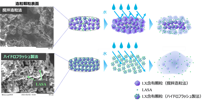 LXは水に溶解すると粘性を生じる性質があります。そのため、LX含有錠剤が水と接触すると、錠剤表面に存在するLXが水に溶解し粘性を生じてしまい、錠剤内部への水の浸透が阻害され、錠剤の崩壊時間が遅延してしまうと考えられます。撹拌造粒法で製造したLX含有造粒顆粒表面には、水なじみのよいLASAが確認されなかったことから、錠剤内部への水の浸透が阻害されたままとなっていると思われます。一方、ハイドロフラッシュ製法では、水なじみのよいLASAをLX含有造粒顆粒表面に均一に点在させることができていることから、水の浸透が錠剤表面で阻害されず、水が錠剤内部に素早く行きわたり、速い崩壊時間が実現できたものと考えられます(図3)。