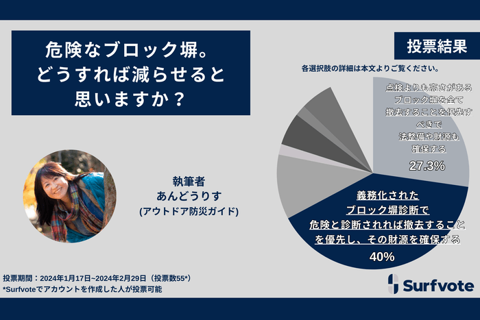 日本は大地震で得た教訓を活かせるのか?「倒壊するおそれがあるブロック塀」について、Surfvoteで意見投票。40%が「財源を確保し、危険なブロック塀から優先的に撤去すべき」と回答。