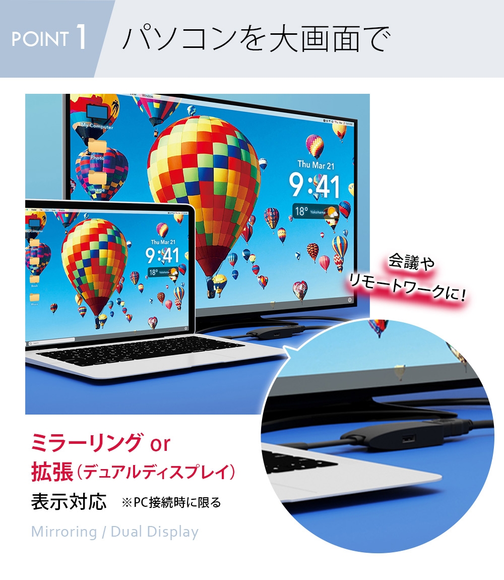 ※著作権保護機能(HDCP)について:端末やTVがHDCPに対応している必要があります。機種やアプリによってはミラーリングができない場合があります。