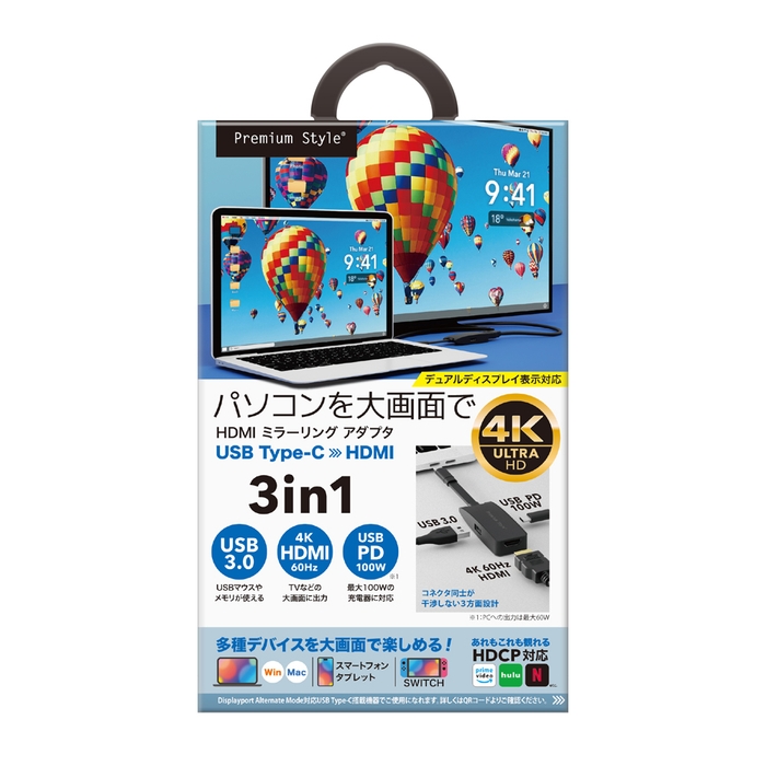 スマートフォンやデジタルオーディオ端末等のアクセサリーブランド『Premium Style』の企画・製造・販売を手掛ける株式会社PGA (本社:神奈川県横浜市都筑区、代表取締役:黒木 光) は、このたびTYPE-Cポート搭載のタブレットやノートパソコン、スマートフォンやSWITCHの画面をテレビに転送できるHDMIミラーリング アダプタを4月26日(金)から新発売いたします。