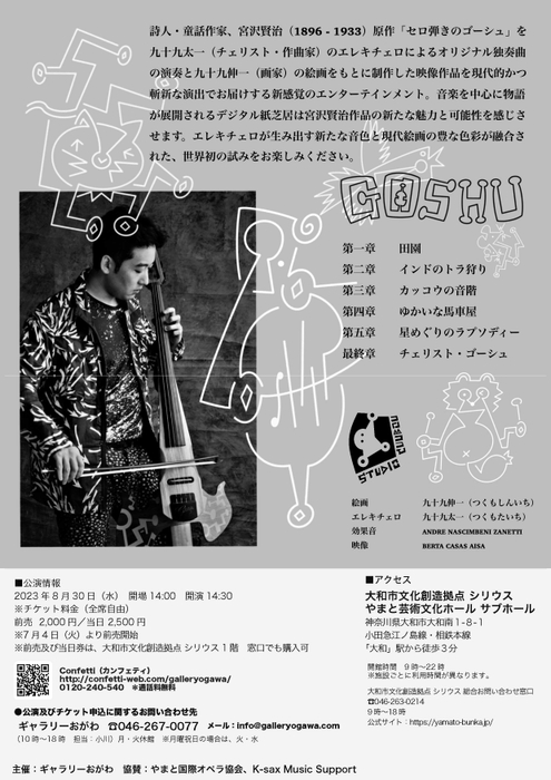 ギャラリーおがわ主催、『九十九太一「GOSHU」エレキチェロ・コンサート』が2023年8月30日 (水)に「やまと芸術文化ホール サブホール」(神奈川県大和市大和南1丁目8番1号)にて開催されます。