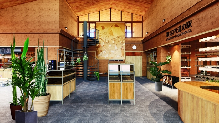今回のリニューアルでは、「すべてがサスティナブル」をテーマに掲げ、地域の歴史や自然を未来につなぐことを目指します。自然をイメージした緑豊かな内装の店内に、地元の廃材を活用した什器を配置。サスティナブルな雑貨やアロマ商品、観葉植物を扱うショップとホットサンドやスムージー、ハンドドリップコーヒー等を楽しめるカフェを併設します。道の駅だけど今までの道の駅とは一味違う、美味しいものやこだわりの雑貨が集まった心地よい空間。旅行者から地域住民まで、多くの人が繰り返し訪れる場となり、「なんかいいな」と思ってもらえる。そんな、今までにない道の駅を目指します。