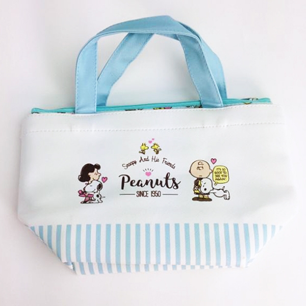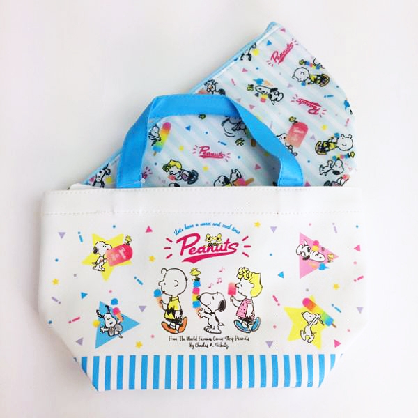 濃いめのブルーのランチバッグです。アイスを持ってゴキゲンなスヌーピーたち♪PEANUTSのロゴもポップです。内側のポーチもストライプ地になっているのが分かりますね。