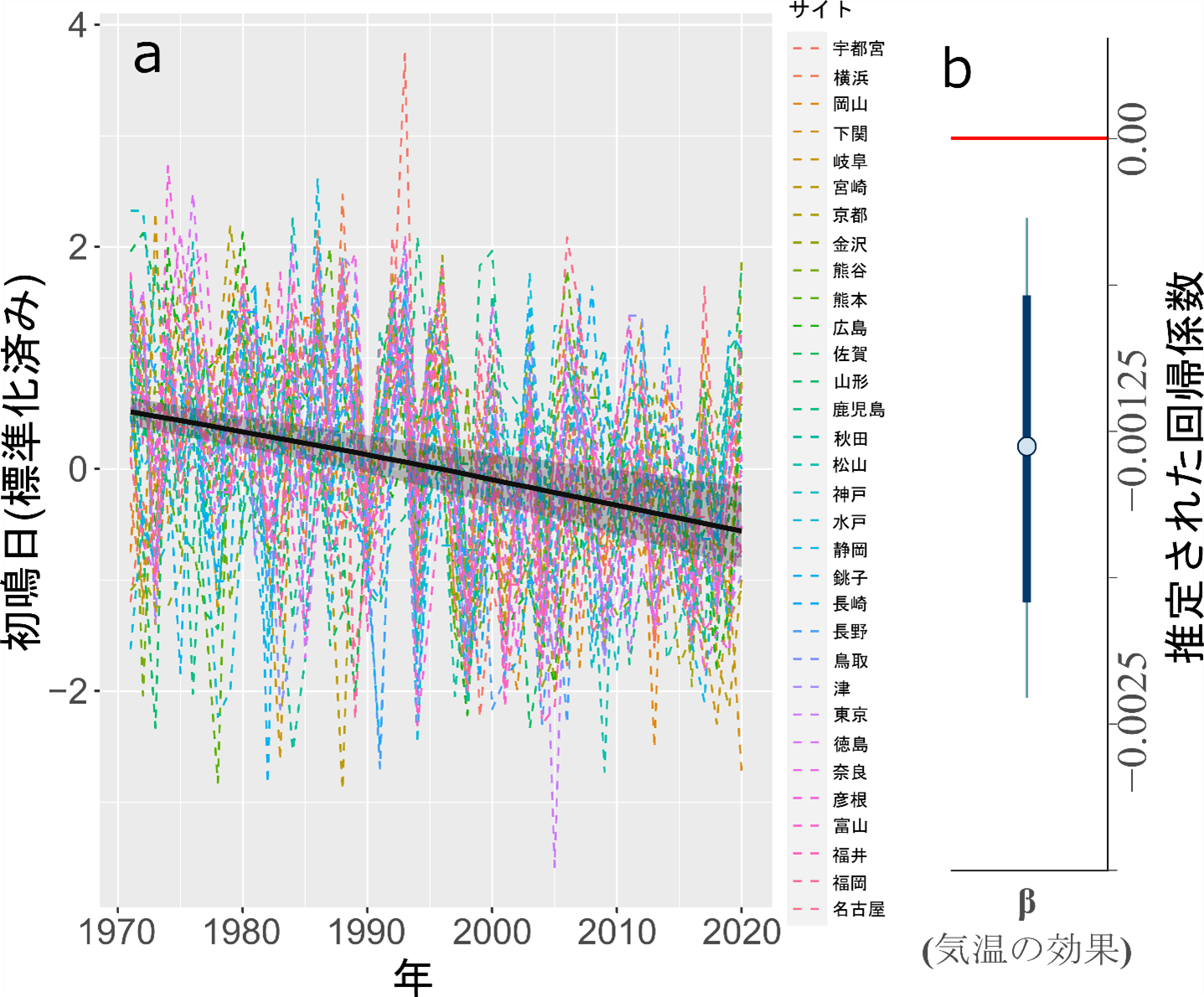図3.状態空間モデルによる予測結果。(a)状態空間モデルで予測された初鳴日の経年変化。折れ線は各気象台で記録されたアブラゼミの初鳴日の実測データを表し、黒太線は状態空間モデルで予測された初鳴日の予測値を、灰帯はモデルで予測された95%信用区間を表している。(b)推定されたパラメーターの回帰係数の95%信用区間。太・細エラーバーは、それぞれ推定された回帰係数の75パーセンタイル値と95パーセンタイル値を表す。気温の効果が統計的に顕著な負の効果を持っていたことから、気温の上昇が初鳴日を早めていることを意味する。