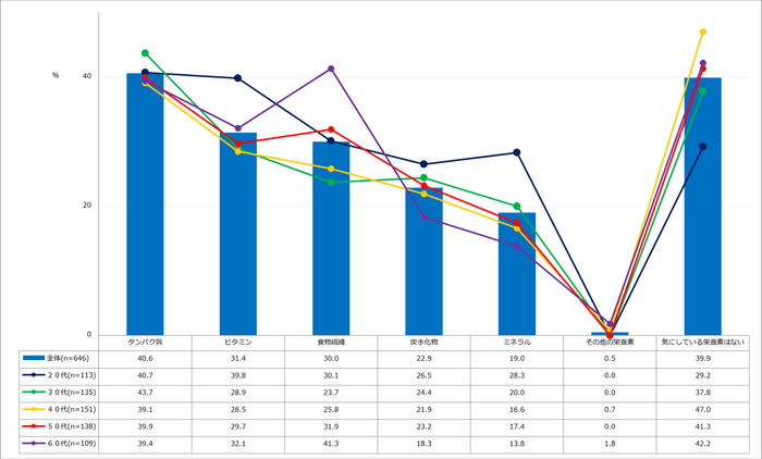 お弁当を作る際、最も気にされている栄養素は「タンパク質」で40.6%でした。「ビタミン」31.4%、「食物繊維」30.0%が続きます。「タンパク質」はすべての年代で気にされている栄養素でしたが、「ビタミン」は20代に、「食物繊維」は60代の女性が特に気にしていました。盛り付けについて悩みが多かった40代の女性は「気にしている栄養素はない」と回答した人が47.0%で全年代の中で最も多く、栄養素の部分では気にしている人が少ない傾向にありました。