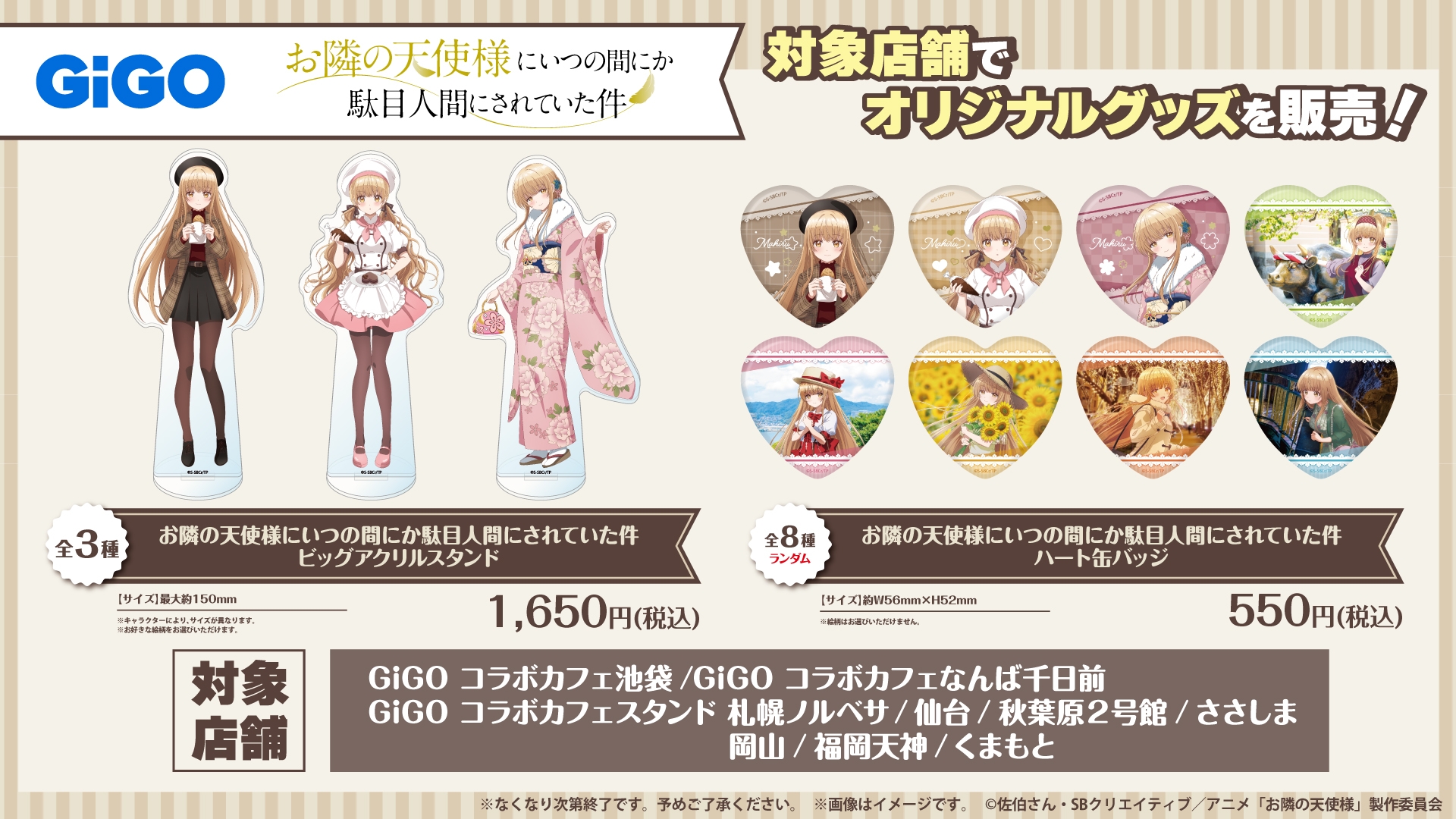 販売店舗:GiGO コラボカフェスタンド札幌ノルベサ、GiGO ドリームタウン白樺、GiGO 西友手稲、GiGO仙台、G iGO 総本店、GiGO 池袋1 号館、GiGO コラボカフェスタンド池袋、GiGO 池袋3 号館、GiGOコラボカフェスタンド秋葉原2 号館、GiGO 渋谷、GiGO コラボカフェスタンドマーケットスクエアささしま、GiGO 金山、GiGO 難波アビオン、GiGO コラボカフェなんば千日前、GiGO コラボカフェスタンド岡山、GiGO 広島本通り、GiGO コラボカフェスタンド福岡天神、GiGO ヨドバシ博多、GiGOコラボカフェスタンドくまもと