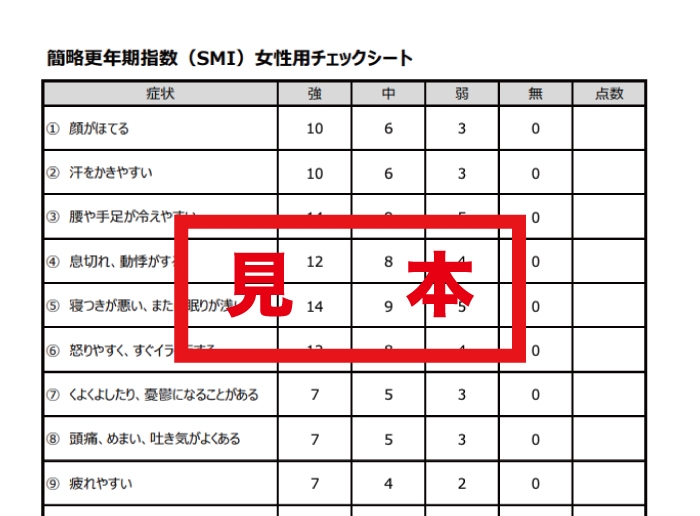 女性の場合、「簡略更年期指数(SMI:Simplified Menopausal ID:ndex)」で更年期の症状の程度を判断します。顔がほてる、汗をかきやすい、頭痛がよくあるなど、女性の更年期でよくみられる症状が判断項目として設けられています。