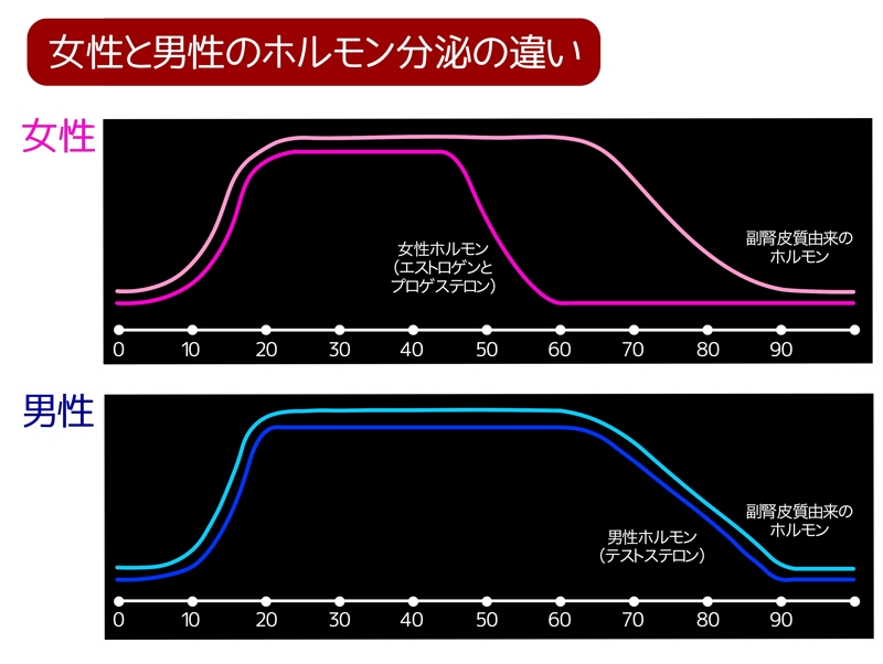 男性では、睾丸ホルモンのテストステロン分泌の減少により、身体的な症状や精神的な症状がみられますが、個人差が大きく、また、女性に比べて性ホルモンの減少が穏やかであり、身体的・精神的な変化も緩徐に表れるため、女性ほど更年期の変化がみられにくくなります。