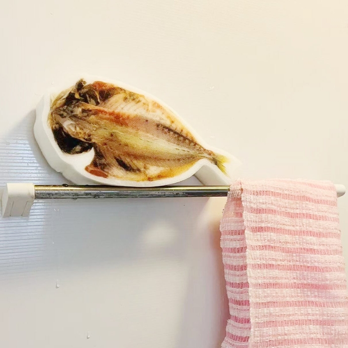 一見すると本物の干物と見間違えるほど精巧にプリントされたデザインが目を引く本商品ですが、その正体は、お風呂で使用できる柔らかなバススポンジです。