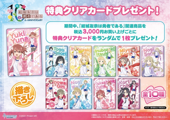 期間中、「結城友奈は勇者である」10周年記念 勇気のバトン展関連商品を3,000円(税込)お買い上げごとに特典クリアカード(全10種)をランダムで1枚プレゼント!
