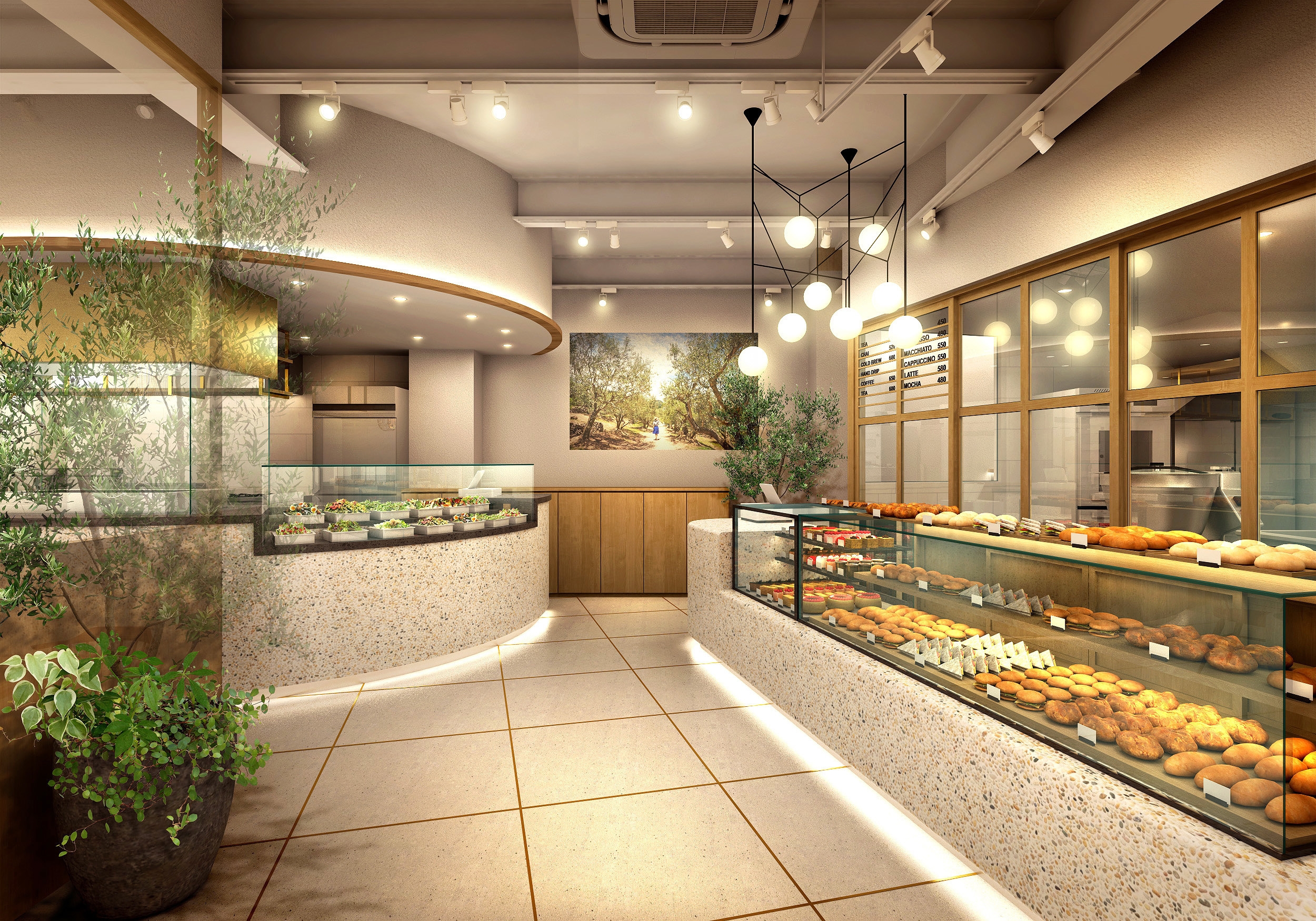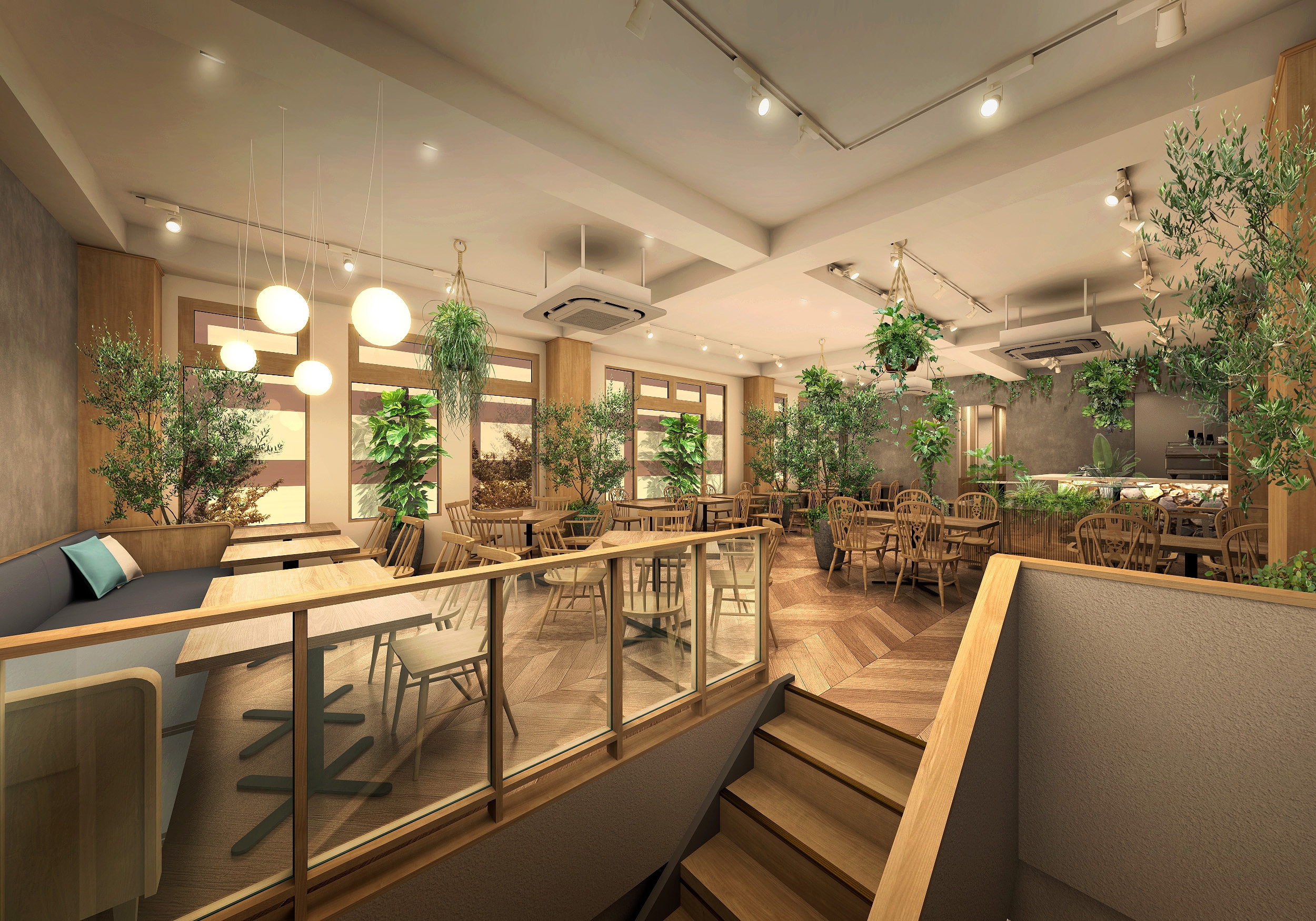 内装には、小豆島のそうめんやオリーブの実をイメージした照明や、エントランスに設置しているオリーブの植栽など、小豆島をイメージした内装にもご注目いただければと思います。