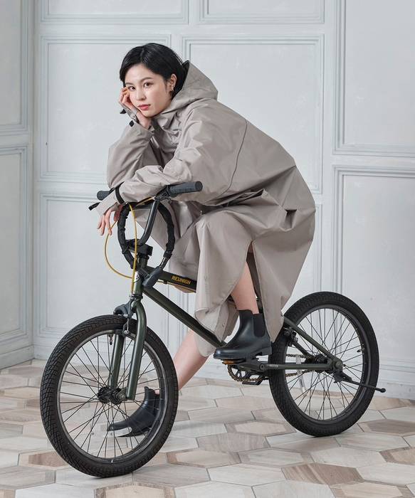 今季の新作「レインバイシクルスリーブポンチョ」。ツバ付きフードやリフレクターに加え、手の甲まで覆うことができる手甲カバーとサムベルトも装備。無地カラーのシンプルなデザインは自転車に乗るときだけでなく、レインポンチョとして普段使いもできる2WAY仕様です。