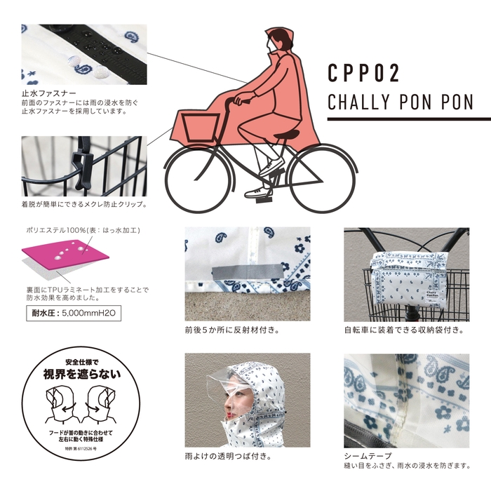 荷物が濡れないよう、レインポンチョを自転車のカゴにサッとかぶせて使う 「チャリーポンポン」。首の動きに合わせてフードが左右に動く仕様なので視界を遮らず、安全に運転することができます。