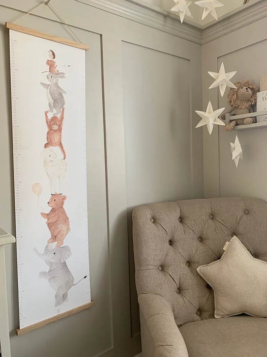 子供部屋インテリアにおすすめです。お子様への入学祝いやお誕生日プレゼントにも喜ばれるアイテムです。7匹の動物の絵の身長チャートは、壁に掛けるだけでもおしゃれで可愛く、優しい色とタッチなのでどんなインテリアにも馴染むデザイン。綿100%のキャンバスに印刷されているので紙のものよりも丈夫です。床から60cm空けて壁に吊るすだけで、子供たちの身長を記録できます。下側の木のバーを取り付けて使用してください。センチメートル表示とインチ表示があります。