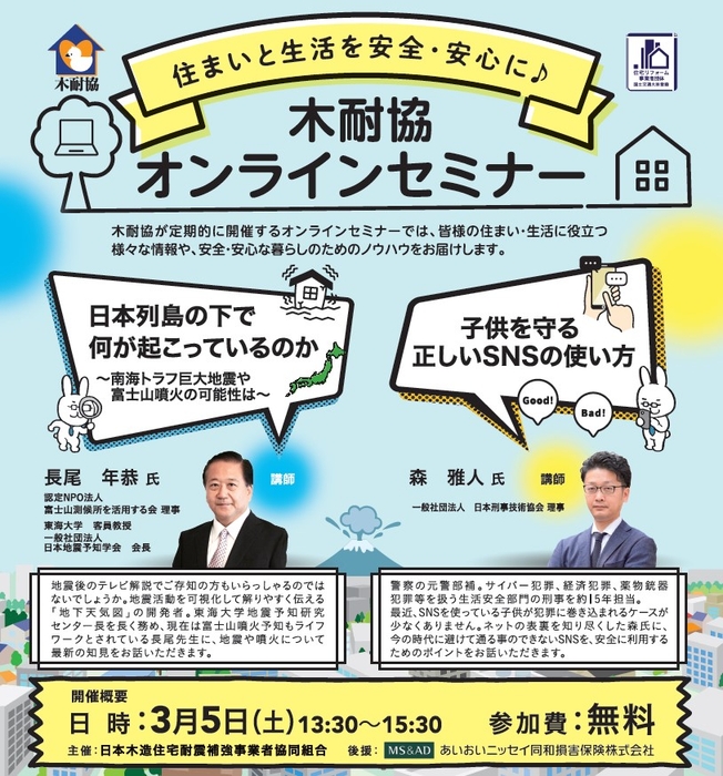 木耐協(正式名称:日本木造住宅耐震補強事業者協同組合/事務局:東京都千代田区/理事長:小野秀男/組合員:全国約1,000社)は、必ず来る地震への備えを広く多くの方に進めていただきたいとの想いから、「住まいと生活を安全・安心に 木耐協オンラインセミナー」を3月5日(土)に開催することとなりました。