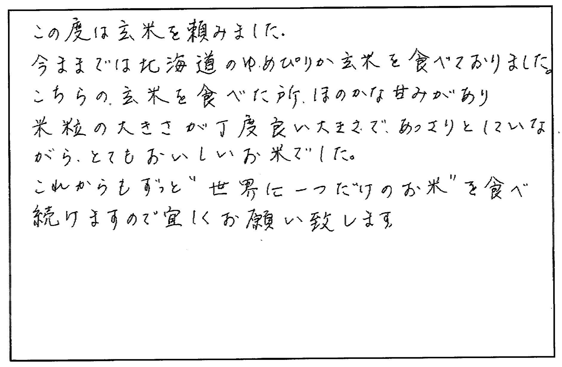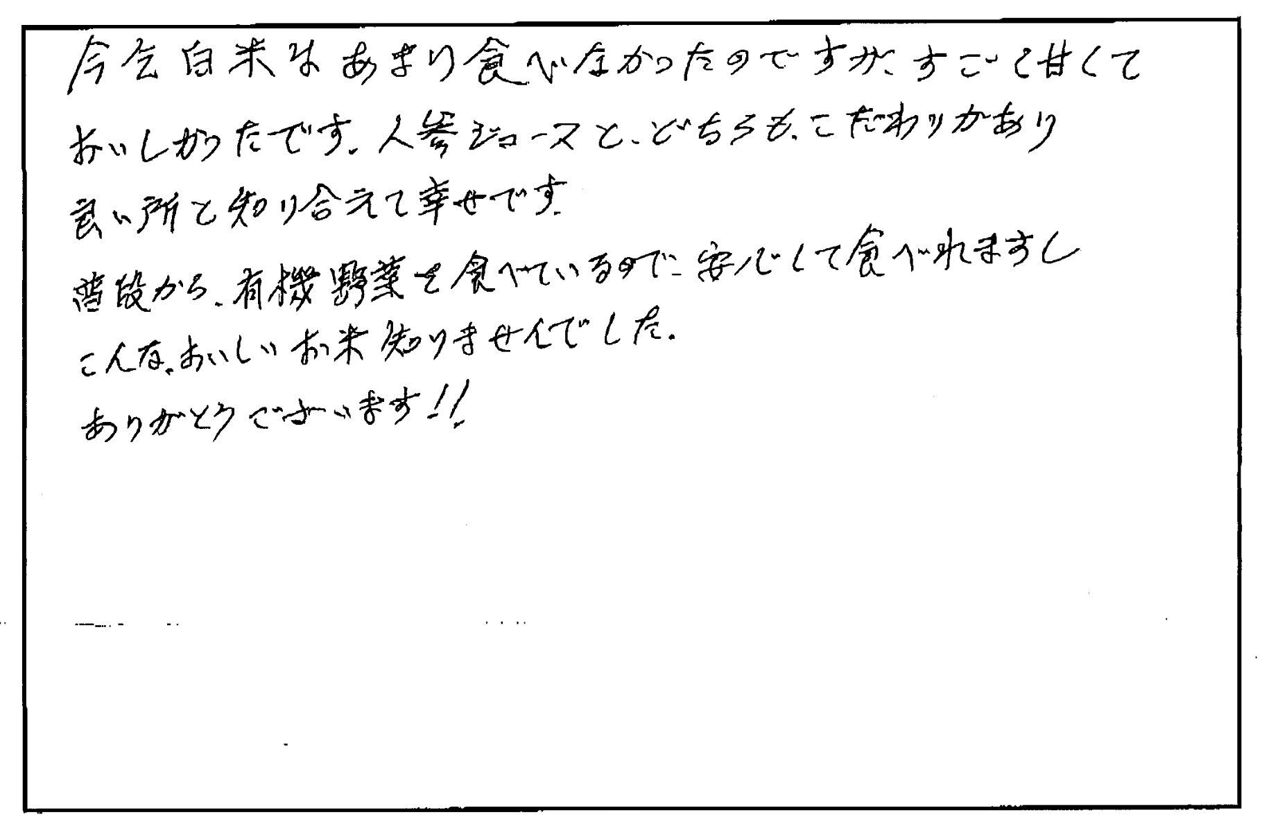 出口農園には、直接お取引させていただいている個人のお客様からのお声が、お手紙などで寄せられています。「お米がおかずなしで食べられるほどおいしい」「人参ぎらいの子どもが食べられるようになった」など、感動の声が届くたび、従業員で喜びを共有しています。