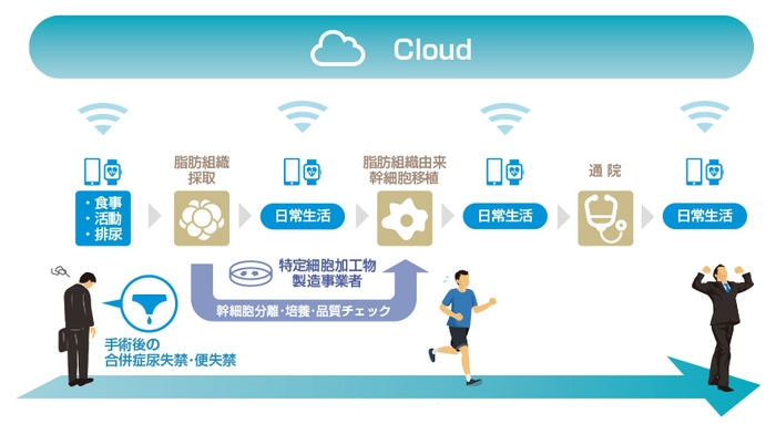 今回の共同研究においての対象疾患は、前立腺がんの手術後に発生する腹圧性尿失禁である。同疾患は、患者の日常活動、精神状況などに広く影響を与え、生活の質(QOL)を低下させる。同疾患に対する再生医療の治療法確立を支援する形でスタートする。(図1)