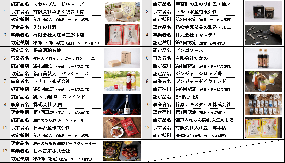 福山ブランドコーナーに出展する認定品一覧(予定)