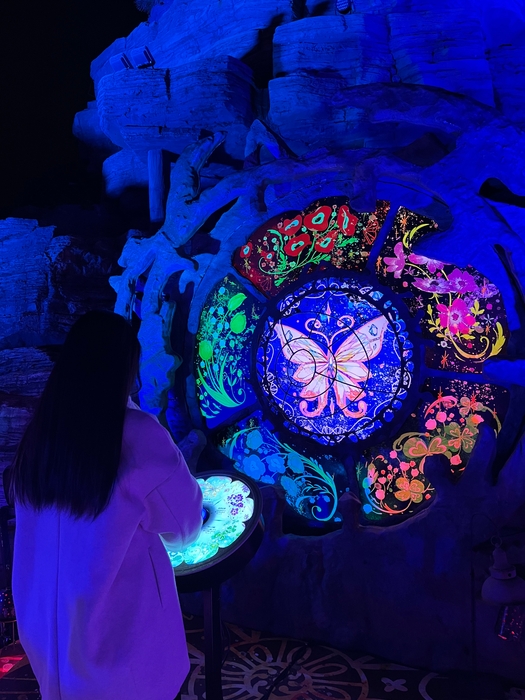 イルミネーションを使って占いができる体験型エリアです。マジカルラグーンステージに設置された花占いのボタンを押すとルーレットが始まり、「レッド、ブルー、イエロー、グリーン、パープル、ホワイト」の中から1色に「花占いの泉」エリアが染まります。あなたの推し色に染まれるかどうか、ぜひチャレンジしてみてください。