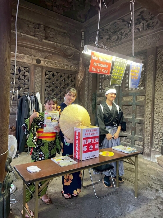 このほか、善徳寺の山門横ではボランティア協議会が支援を続けている能登半島地震・豪雨災害の支援募金も呼びかけ、募金をしてくれた方が学生が扮する踊り子と記念撮影できるブースも人気を呼んでいました。祭は午後8時にクライマックスを迎え、中心部では観光客も参加して踊り続ける「総おどり」が始まると、学生たちも全員が参加し、午後10時の終了まで踊り続けました。