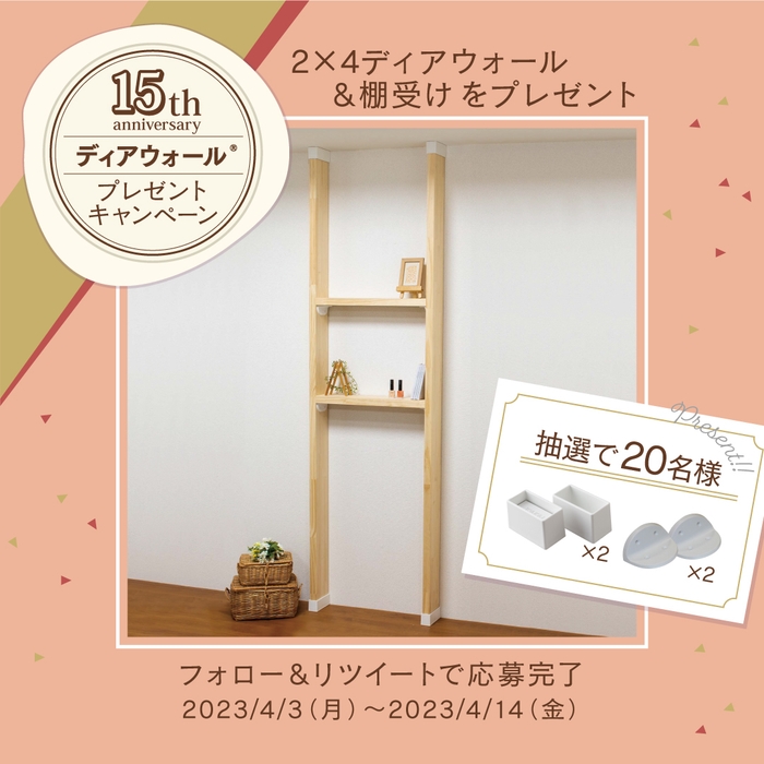 ねじ・釘などの建築資材を製造・販売する若井ホールディングス株式会社(本社:大阪府東大阪市、代表取締役:若井 俊宏)は、公式Twitterアカウントにて「ディアウォール15周年記念キャンペーン」を2023年4月3日(月)から4月14日(金)まで実施します。