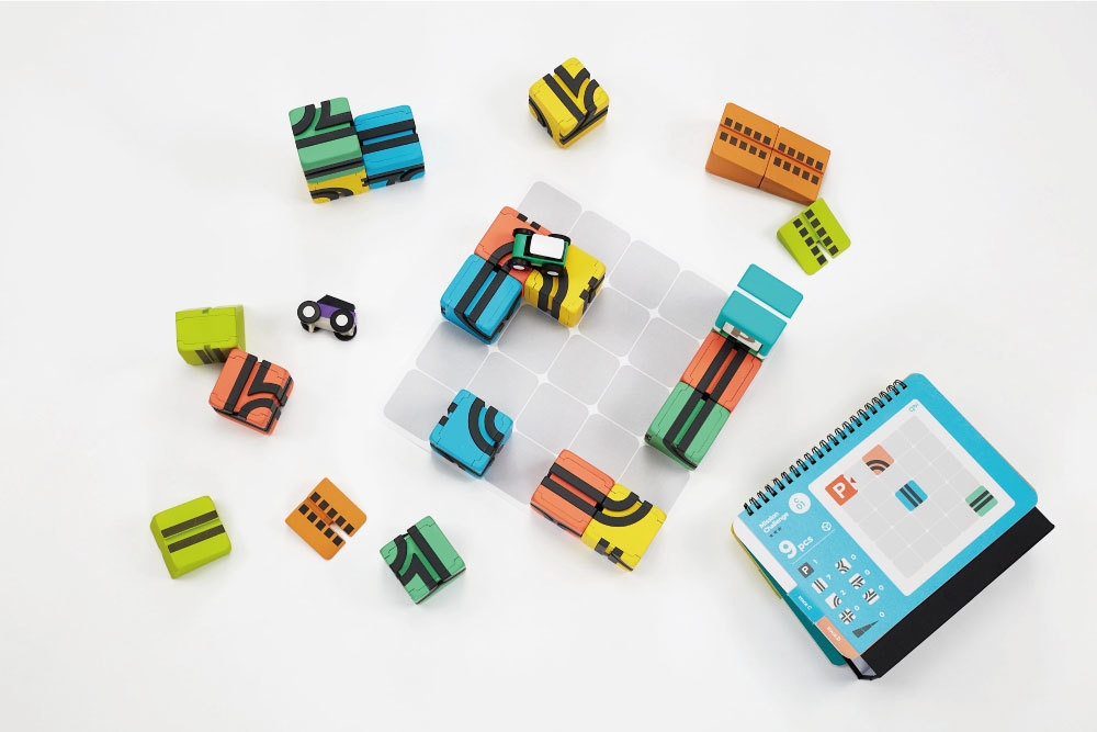 Qbi toy(キュービーアイ)は、6面に直線、カーブ、分岐などさまざまな車が走る道が描かれたキューブ型のブロックを組み合わせて道路を完成させ、車を走らせて遊ぶ台湾生まれの知育玩具です。ブロックの内側には8個の磁石が内蔵されており、お子様でも簡単にブロックを組み立てることができます。道路用のブロック以外にもパーキングや坂道ブロックも用意されており、スタートとゴールを設定したり、上段から下段へ車を移動させたり、さまざまな道を作って楽しむことができます。付属されているチャレンジカードを使って「指定の10ピースを使って、この形を作ってみよう!」「指定の10ピースをシートに配置して、ゴールを目指そう!」といったミッションに楽しく取り組み、自然と「プログラミング的思考力」を育むことができるSTEAM知育玩具となっています。
