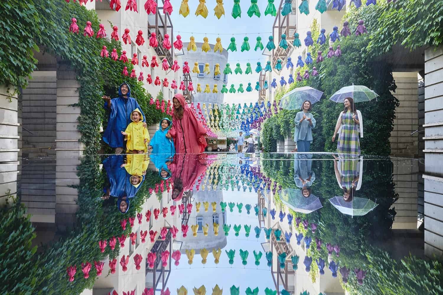 全長150mのピーマン通りに、雨を待ちわびる1,500個の「ふれふれ坊主」が並び、雨に濡れるとより鮮やかに色づきます。さらに今年は、上部に並ぶ「ふれふれ坊主」を映すリフレクションが新たに登場。カラフルで明るい気持ちになれる景色が上にも下にも広がります。また、リフレクションを使って、まるで「ふれふれ坊主」に囲まれているかのような写真撮影も楽しめます。雨の日にはカラフルなポンチョを貸し出しているので、「ふれふれ坊主」と同じ色のポンチョを着て、鮮やかでカラフルな景色の中を散策するのもおすすめです。