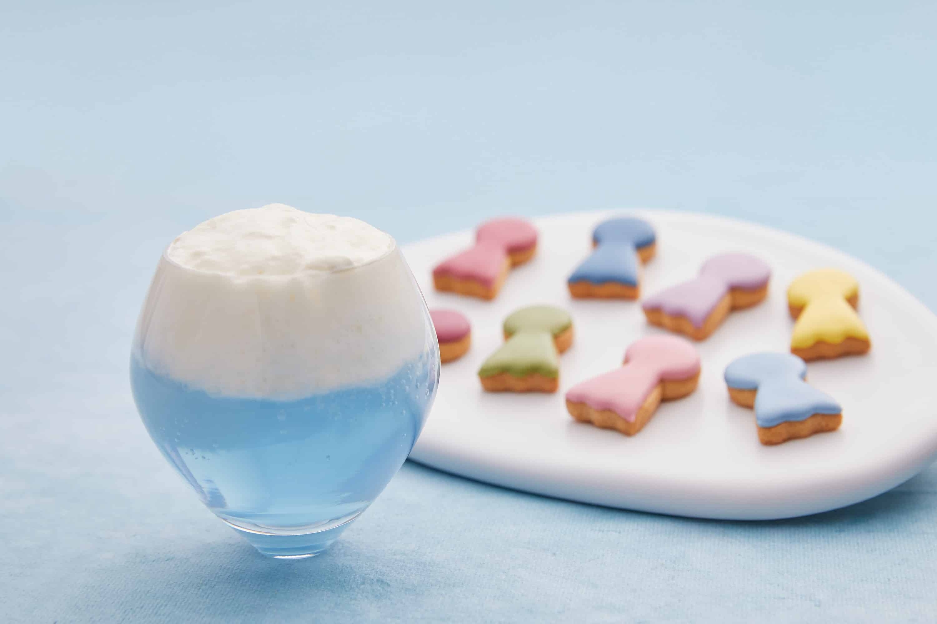 「ふれふれソーダ」は、雨空をイメージしたブルーのソーダの上に、雲のようなふわふわのエスプーマを乗せました。「ふれふれ坊主クッキー」は「ふれふれ坊主」に合わせて8色を用意。好きな1色を選んでソーダに添えれば、まるで「ふれふれ坊主」が雨を降らせているかのようなかわいらしいドリンクを楽しめます。