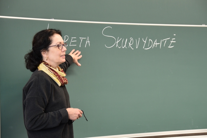 スクルヴィダイテ学部長は今年8月、本学の「杉原千畝と難民に関する研修プログラム」の一行がリトアニアの首都ヴィリニュスを訪れた際、2日間にわたってヴィリニュス大学の構内や旧市街などを案内したほか、同大ではハチミツ酒やバウムクーヘンの起源とされるお菓子「シャコーティス」をふるまってくれました。今回は都市情報学部の国際交流プログラムで本学を訪問しました。