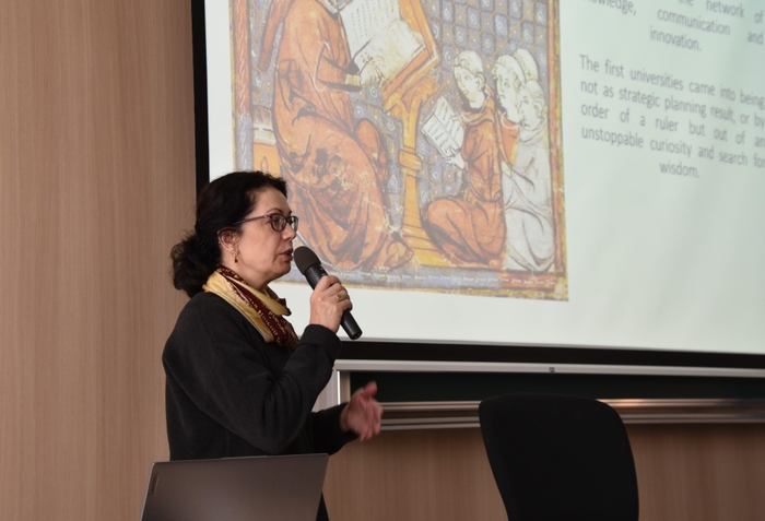 本学と学術交流の協定を締結しているリトアニアのヴィリニュス大学歴史学部長のロレッタ・スクルヴィダイテ教授が12月6日、ナゴヤドーム前キャンパスで、都市情報学部の稲葉千晴教授が担当する講義「国際社会と政治」でゲストスピーカーとして登壇し、ヨーロッパの大学の歴史について解説しました。