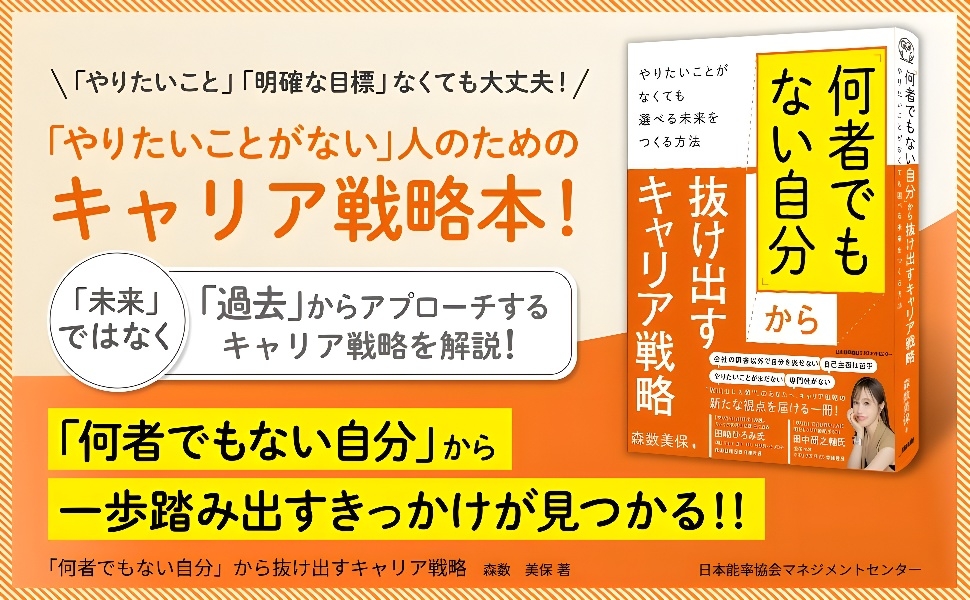 キャリアと組織戦略の専門家、森数美保さん初の著書『「何者でもない自分」から抜け出すキャリア戦略 〜やりたいことがなくても選べる未来をつくる方法〜』が2025年4月25日に日本能率協会マネジメントセンターより発売されます。