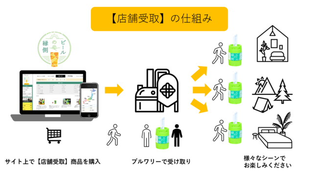 『ビールの縁側』サイト上で決済した商品を、ブルワリーで受け取ることができるサービスです。行きつけのブルワリーや旅先のブルワリーのビールを事前にサイト上で購入し、ブルワリーで受け取り、ご自宅や宿泊先に持ち帰り、新鮮な樽生クラフトビールを気軽にお楽しみいただくことができます。