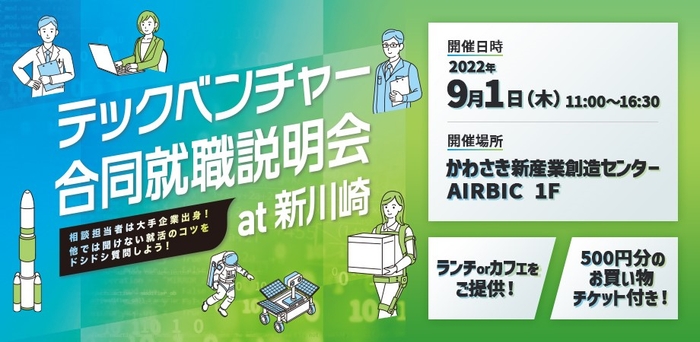 次世代のものづくりを担う、注目のベンチャー企業が勢ぞろい。 「テックベンチャー合同就職説明会at新川崎」を9月1日(木)に開催。