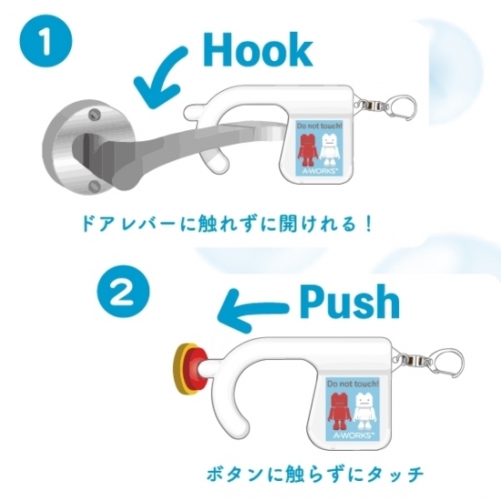 このように、ドアノブに引っかけて使えば、不特定多数の人が触ったところも気にせず開けられちゃいますよ。