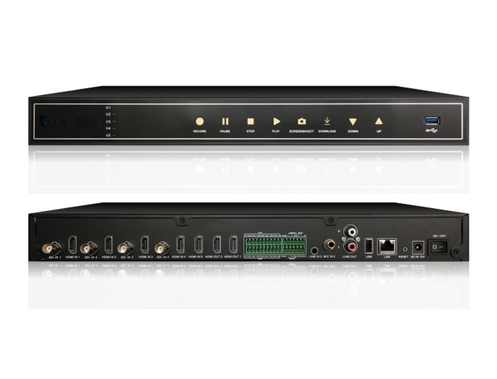 最大5つの映像を簡単に合成録画できるライブエンコーダ。筐体前面のボタン操作で手間なく収録を開始/終了できる。USBデバイスへの収録や、ネットワーク経由で手軽に動画を取り出すことも可能。