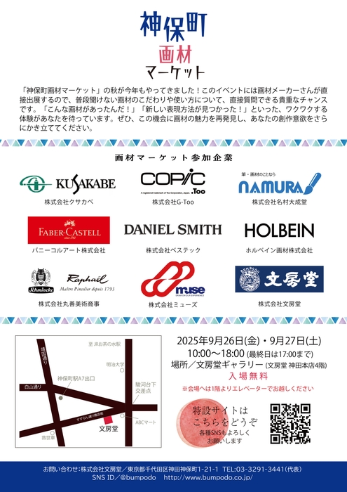 株式会社文房堂(本社:東京都千代田区神田神保町、代表取締役会長:石田 純也)は、2025年9月26日(金)・27日(土)の2日間、画材体験・画材販売イベント「神保町画材マーケット2025」を、文房堂ギャラリー(文房堂神田本店4階)にて開催いたします。入場無料で、初心者からプロのアーティストまで、どなたでもお楽しみいただけるイベントです。