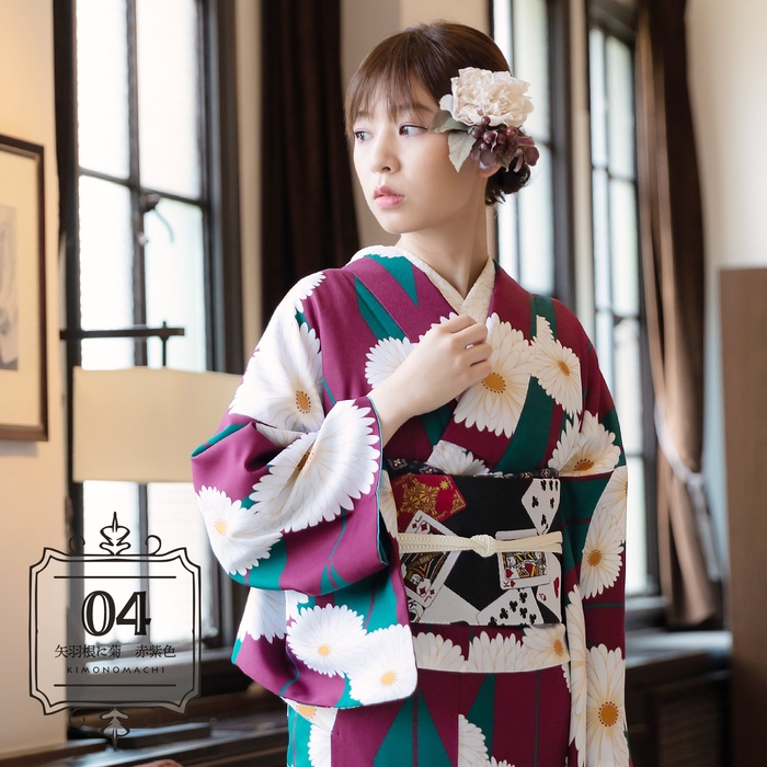 矢羽根に菊 赤紫色