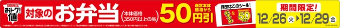 お弁当の需要が高まる年末に向け、本体価格350円以上のお弁当50円引きセールを実施します。人気のお弁当や新商品のお弁当も、お得にお買い求めいただけます。 (店内てづくり弁当は対象外)