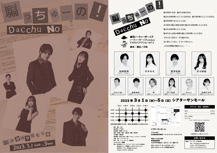 ノーティーボーイズ produce ケミカルリアクション ACT・2『騙っちゅーの!』が2023年3月1日(水)〜5日(日)にシアターサンモール(東京都新宿区新宿1-19-10サンモールクレストB1)にて上演されます。