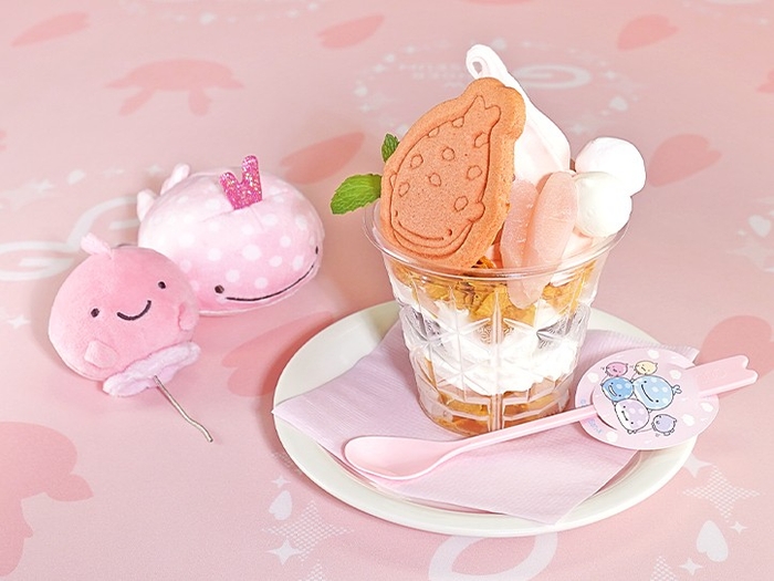岩下の新生姜スイーツを盛り合わせたニュージンジャーパフェをじんべえさんコラボバージョンに。生姜風味でピンク色の「お空柄に染まったじんべえさん」クッキー、「ふうせんうお」をイメージしたピンクと黄色のマシュマロをトッピングしました。10周年記念テーマ「じんべえさんとふうせんうお」のスプーンマーカー付き。