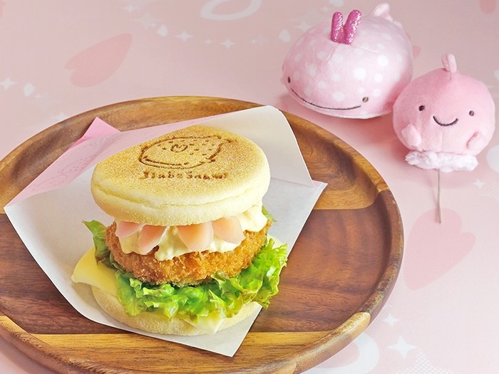 あたまに“岩下の新生姜っぽいもの”がついた「岩下の新生姜じんべえさん」の焼印入りのイングリッシュマフィンで、「岩下の新生姜メンチカツ」、たっぷりの岩下の新生姜スライス、岩下の新生姜入りタルタルソース、スライスチーズ、サニーレタスをサンドしました。