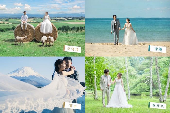 沖縄の青いビーチ、北海道の広大な大地、緑美しい軽井沢、そのほか有名な観光スポットなど、リゾート地でのフォトウェディングについてもお気軽にご相談ください。