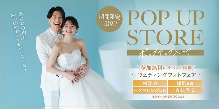 関東9店舗・リゾート2店舗を展開する「スタジオアクア」が出張開催する本イベントでは、撮影体験や相談会、衣装展示などを通じて、普段スタジオに足を運びにくい方にも気軽にウェディングフォトの魅力を体感いただけます。