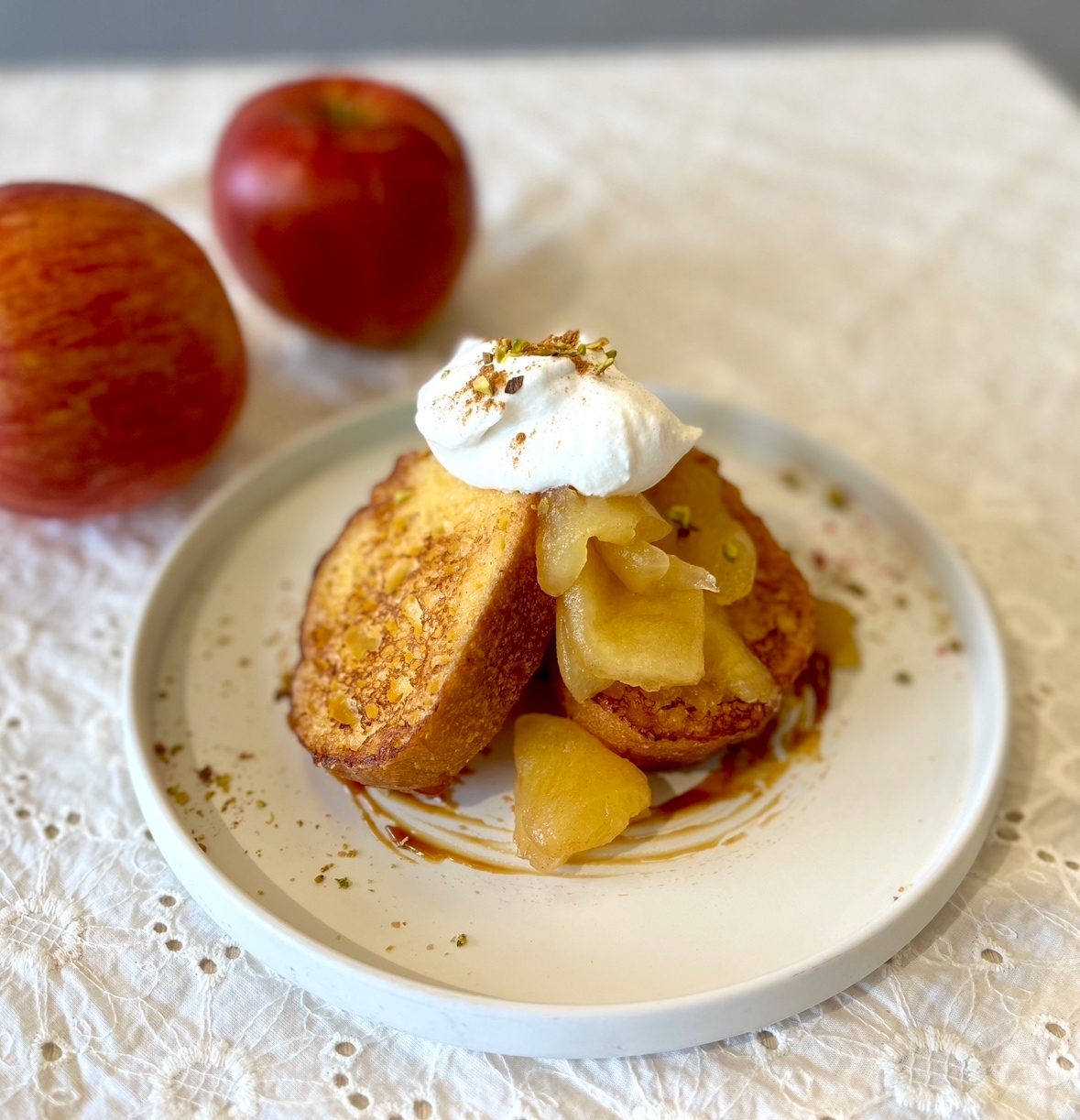 シロップで煮詰めたりんごをのせ、仕上げに軽やかな生クリームとシナモン、ピスタチオをトッピング。