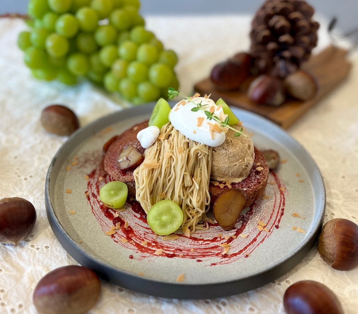 旬のシャインマスカットとスライスした栗を添えて、秋の味覚をぎゅっと詰め込みました。