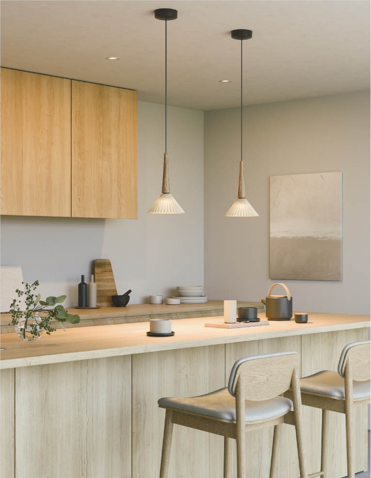 無垢材から削り出した木飾りとプリーツデザインの磁器セードを組み合わせたペンダントライトを8種ラインアップいたしました。磁器特有の優しい陰影と点灯感により、あたたかく落ち着いた雰囲気を演出します。また消灯時は、プリーツのくっきりとした陰影が見え、上品で繊細な印象を空間に与えることが出来ます。色温度は、2色(2700K電球色/3500K温白色)、飾り部分のカラーを2色(タモ、タモ・黒色塗装)ご用意し、お好みのインテリアや目的・用途に合わせてお選びいただけます。